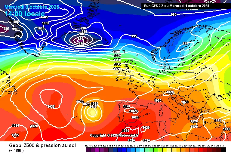 Comme on peut le voir sur la carte de prévision ci-dessous, un puissant anticyclone va se gonfler sur la France, garantissant un temps stable. Simultanément, une dépression très creuse va plonger au large du Portugal. Ce duo va agir comme une véritable pompe à chaleur.