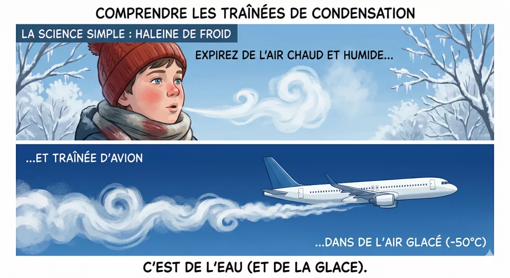 En météorologie et en aéronautique, ces lignes blanches sont appelées des traînées de condensation (ou contrails en anglais). Elles sont créées par un choc thermique très simple :