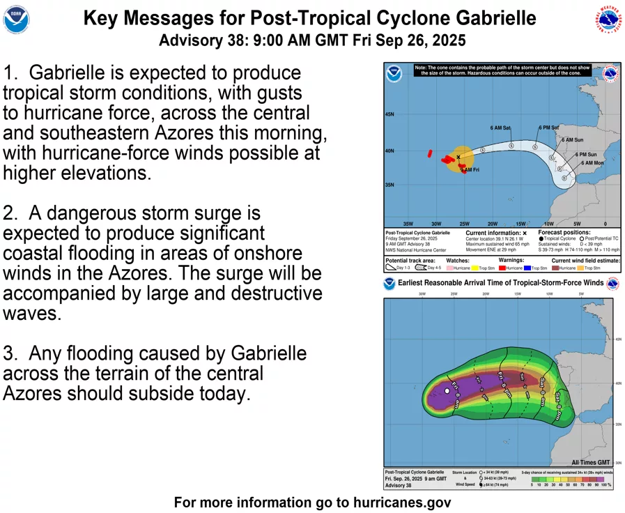 L’impact de Gabrielle se fera en deux temps sur la péninsule ibérique. Le Portugal sera d’abord touché par de fortes pluies et un coup de vent. Puis, l’humidité résiduelle traversera l’Espagne et se réactivera au contact de la Méditerranée, provoquant des orages parfois violents entre la région de Valence et Tarragone.