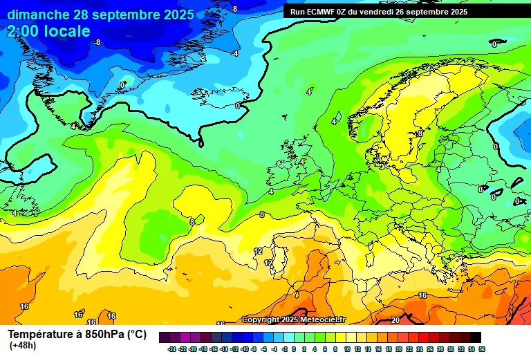Il faut imaginer cette dépression comme un gigantesque moteur atmosphérique. Dans l’hémisphère Nord, les dépressions tournent dans le sens inverse des aiguilles d’une montre. En se positionnant à l’ouest de l’Europe, le système Gabrielle va « enrouler » l’air autour de lui. Sur son flanc Est, celui qui nous concerne directement, il va puiser de l’air beaucoup plus au sud, au large du Maroc et des Canaries, et le propulser en direction de la France.