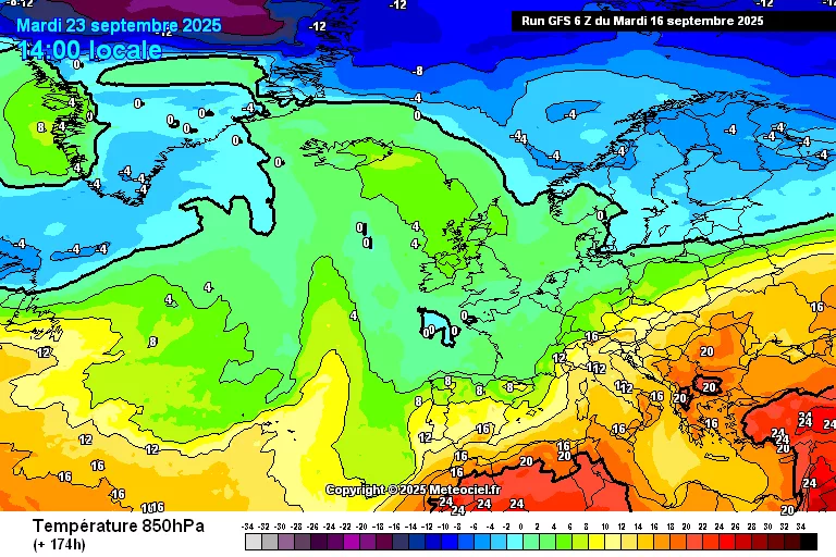 La seconde carte représente les températures à 850 hPa (environ 1500 mètres d’altitude) : elle nous permet de diagnostiquer l’origine et la nature de la masse d’air, en s’affranchissant des effets du soleil en journée.