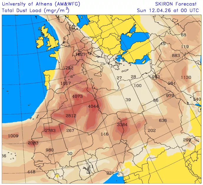 D’après les dernières modélisations atmosphériques (modèle SKIRON), une masse d’air affichant une forte concentration de particules fines en provenance directe du Sahara survolera le bassin méditerranéen tout au long du week-end. Le ciel devrait par conséquent prendre un aspect laiteux ou ocre, caractéristique de la présence de ce sable en haute altitude, filtrant ainsi le rayonnement solaire.