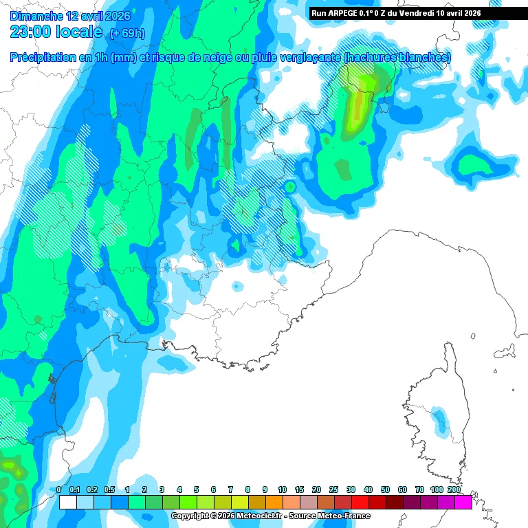 Parallèlement à cette advection de poussières, les prévisions à maille fine (modèle ARPEGE) confirment le passage d’une perturbation pluvieuse sur notre secteur pour la soirée du dimanche 12 avril, avec un pic d’intensité modéré attendu aux alentours de 23h00. Quelques gouttes pourraient également se faire sentir durant l’après-midi.