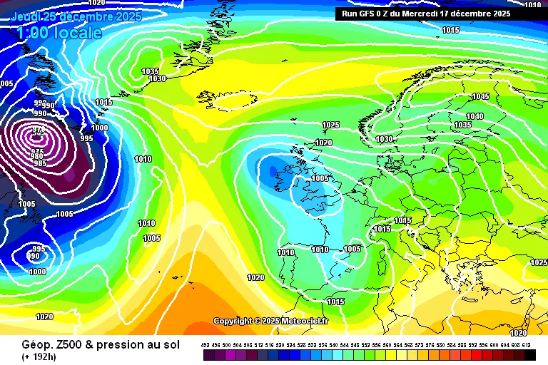 Si l’on regarde la modélisation globale, notamment la carte du modèle GFS pour le jeudi 25 décembre, on observe le positionnement d’un vaste système dépressionnaire (les zones en bleu/violet) centré sur le proche Atlantique et les îles Britanniques.